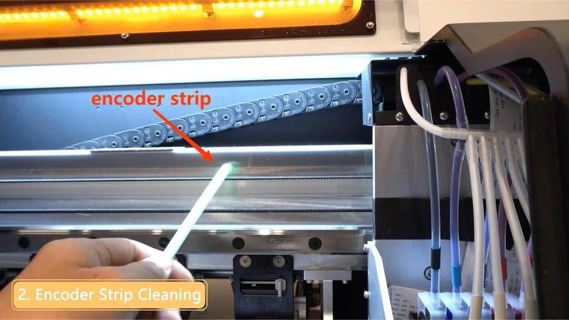 Encoder strip is a sensitive component with lots of magnetic strips on it. It translates the printing task and helps confirm the printing position by sending orders to the print head. Fingerprints, lint or fibers on tissue paper, such things left on encoder strip will damage its sensitiveness and thus leading to inaccurate printings.