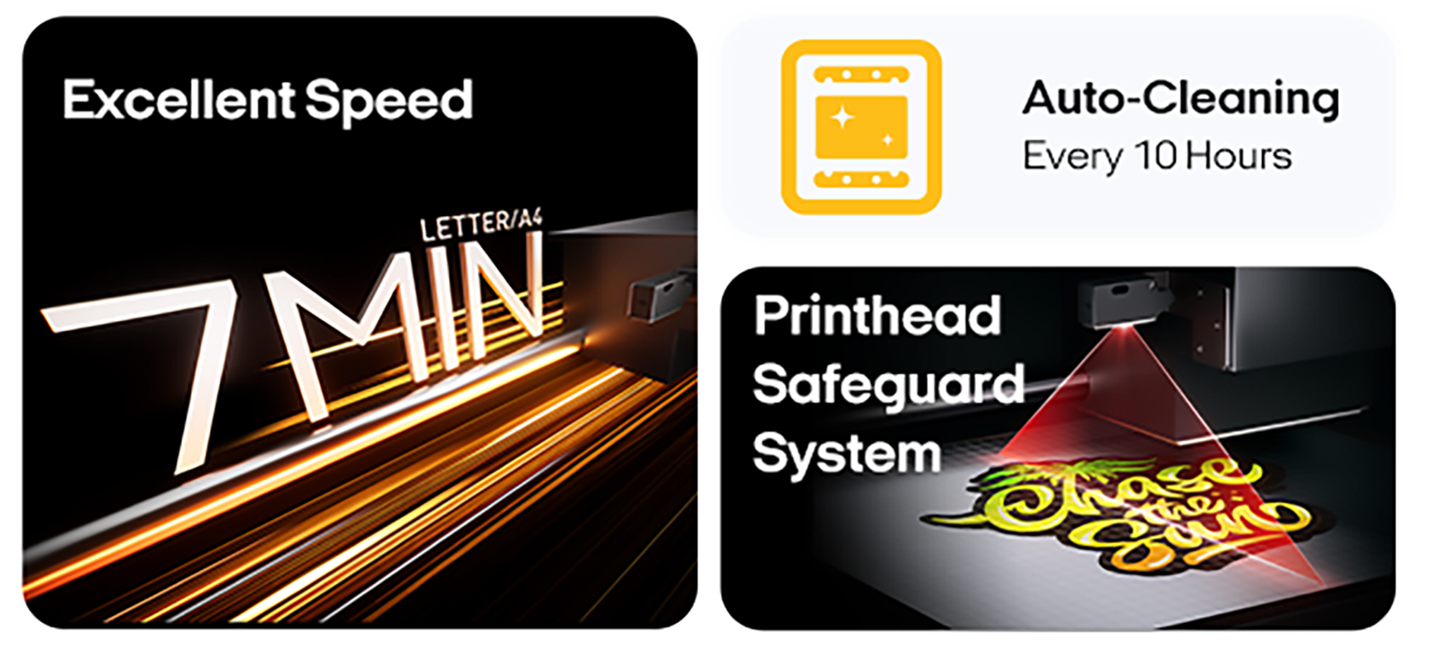 Auto-Cleaning System: A pre-set automatic cleaning system that performs printhead cleaning every 10 hours when a printer is on but idle. This successfully achieves improvement of ink dynamic and reduction of printhead clogging issues, particularly benefiting users about to take a long vacation with their printer unused.