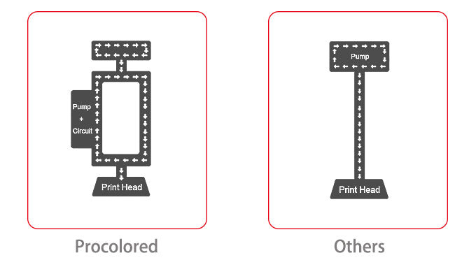 Theink circulation system is our patent technology, the continuous circulation system effectively prevent the nozzle from clogging, thus extend print head lifetime 50% compared to traditional printers.