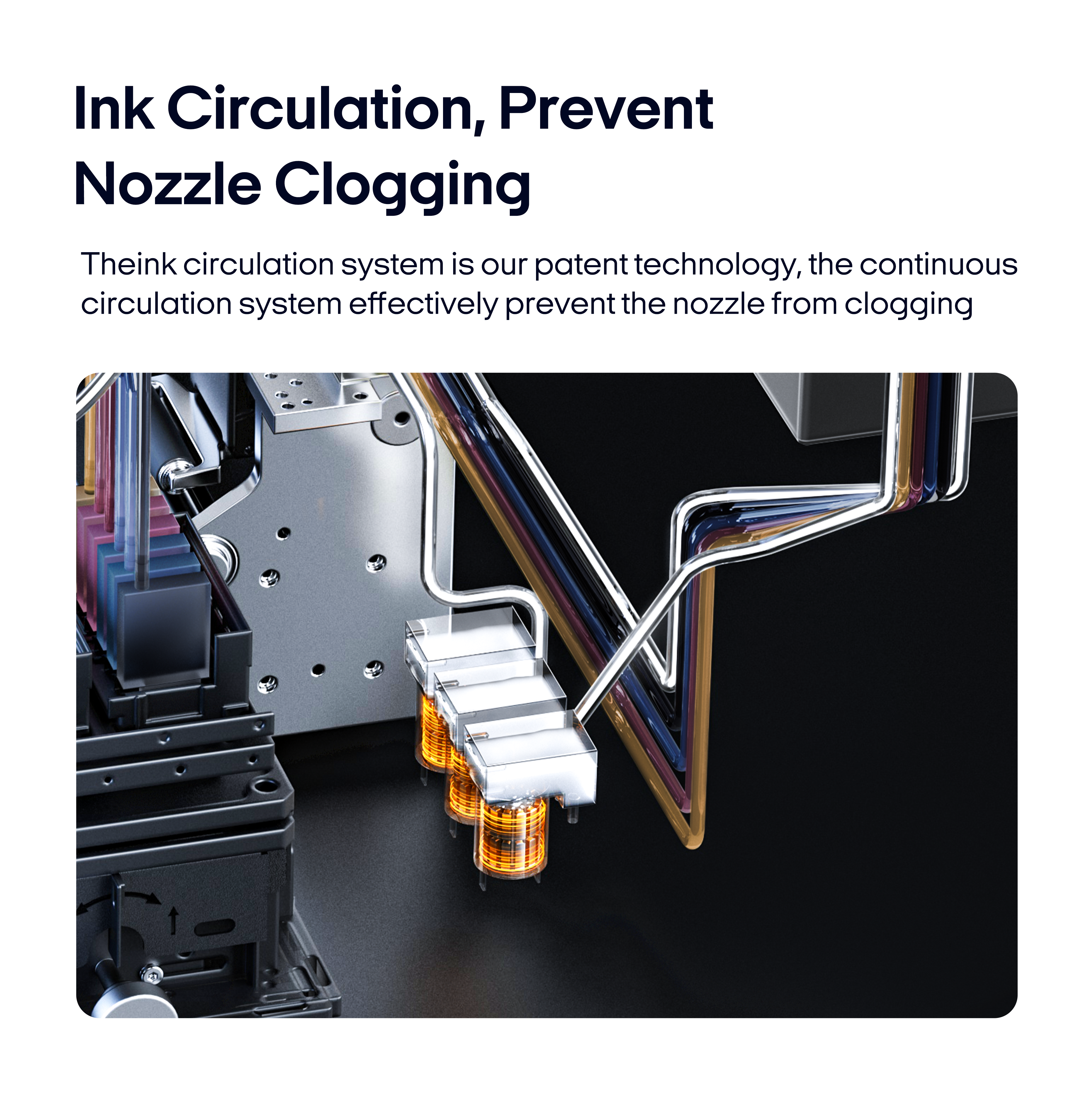 Patented white ink circulation technology, which works continuously and effectively to prevent the nozzle from clogging, extending print head lifetime by 50% compared to traditional printers.