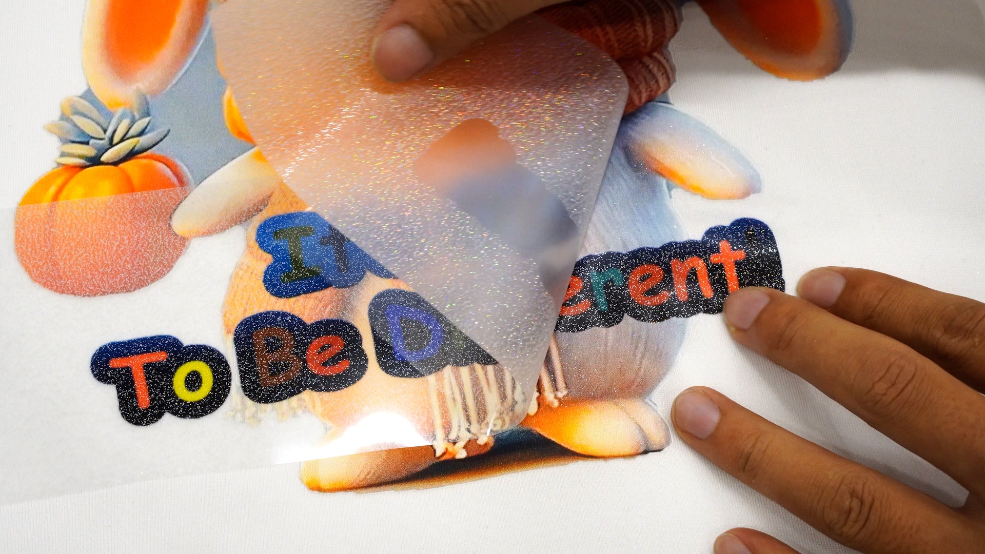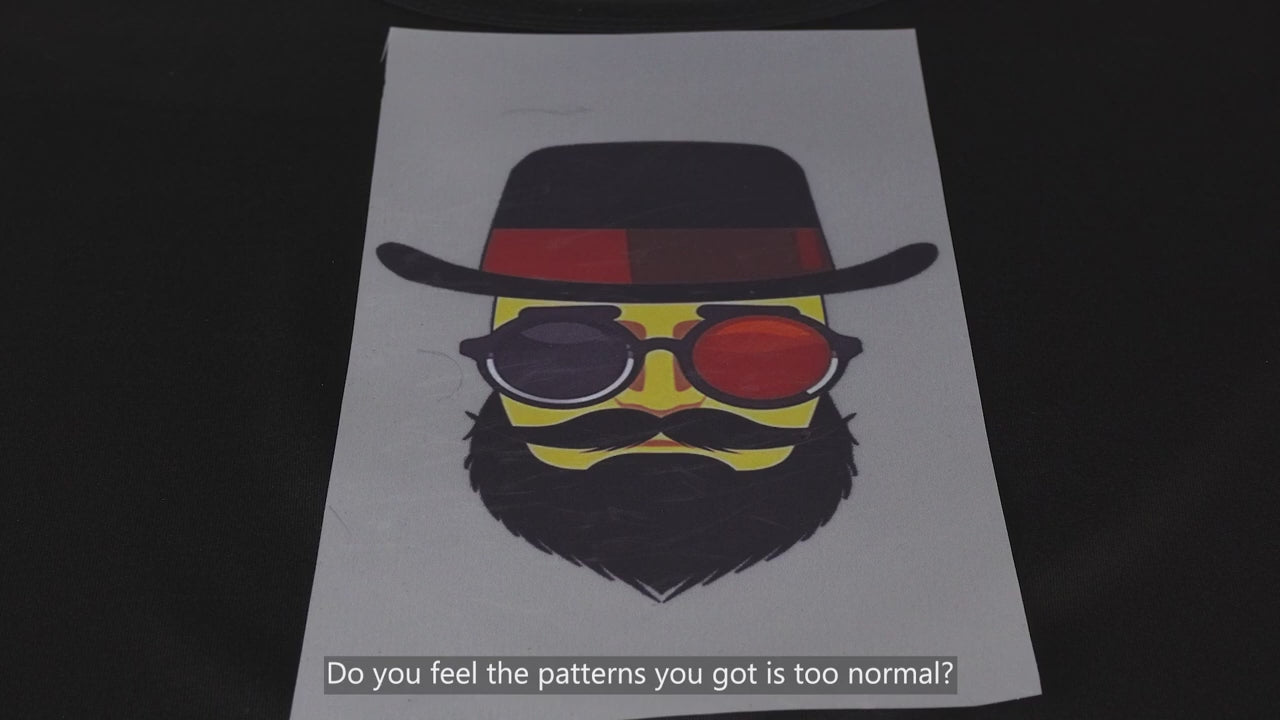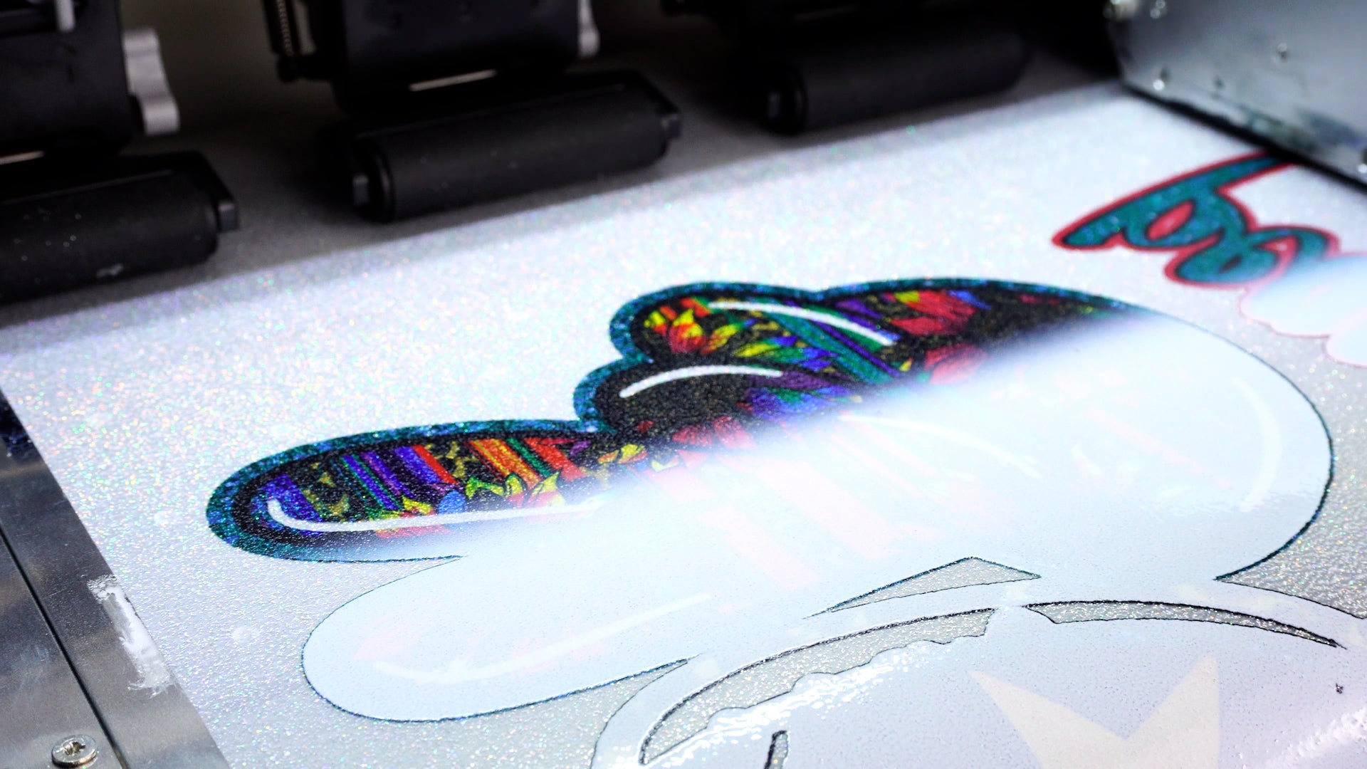 1. Designs are printed onto the glitter film using a DTF printer, after which the print is covered adhesive powder and dried up in an oven.