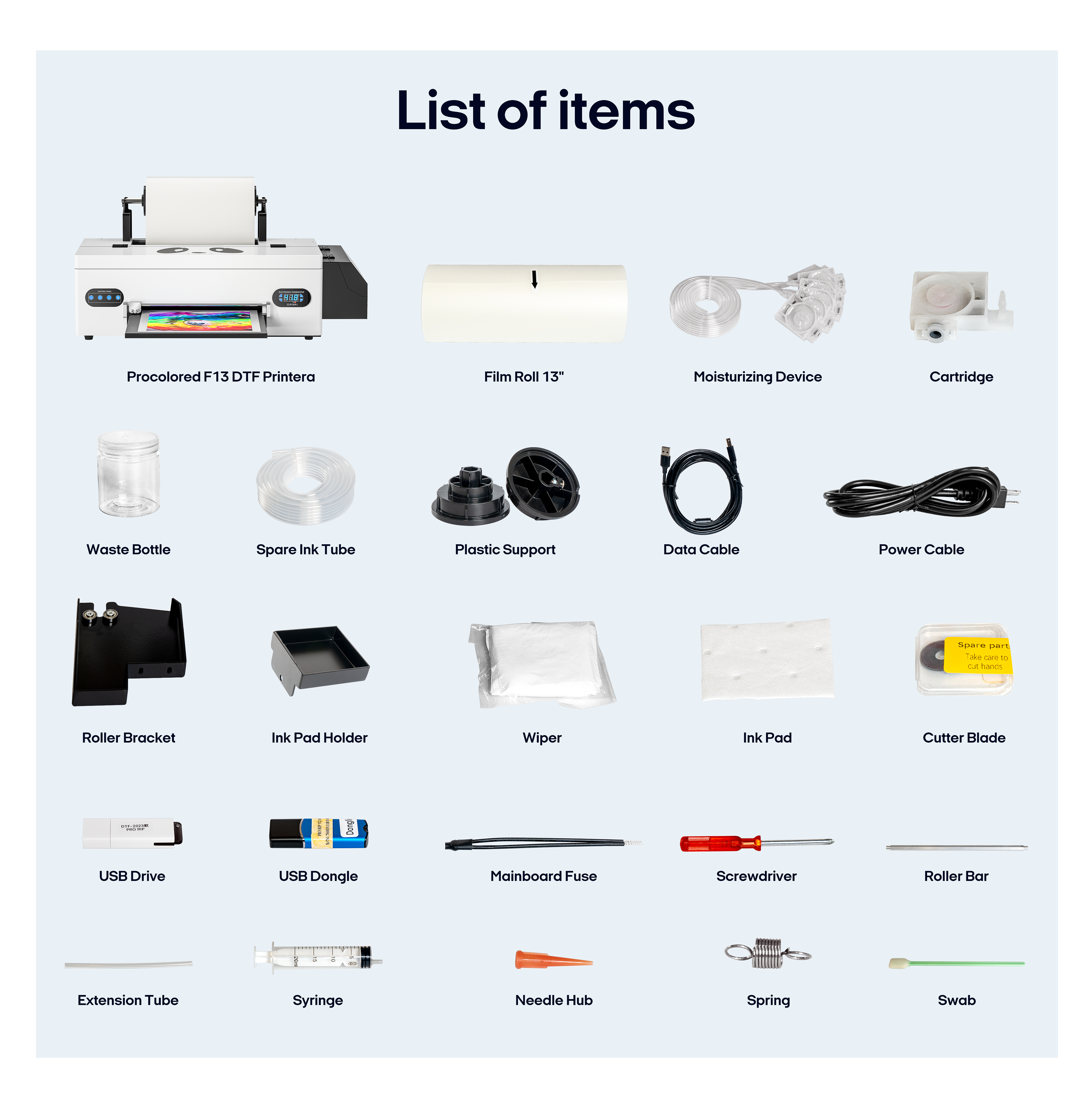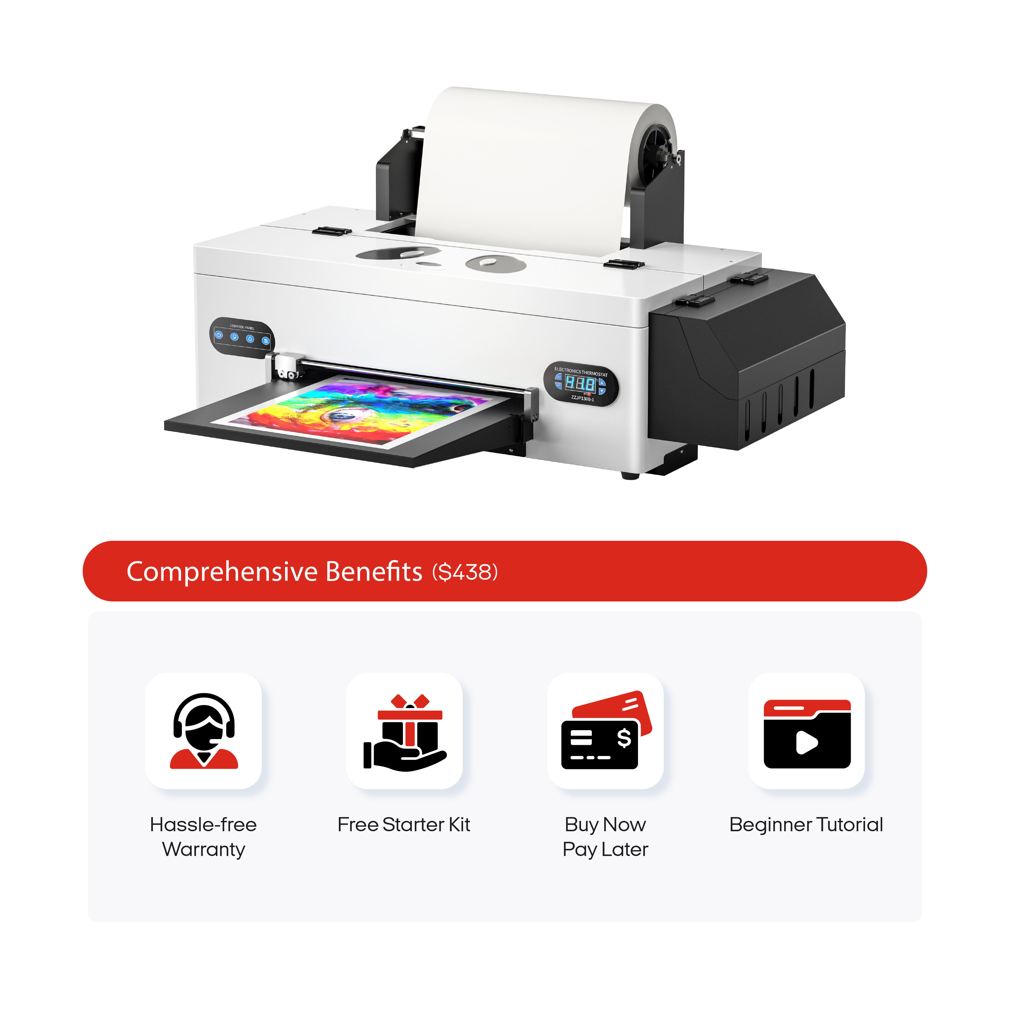 Procolored L1800 DTF printer (Direct to Film printer) is a high-quality and easy-to-use film transfer printer. It delivers industrial-print-quality output at impressive production speeds, and it's an ideal t-shirt printer with the capability of printing on multiple fabric substrates (cotton, poly, blends and more) and different fabric colors (even for fabric in black).