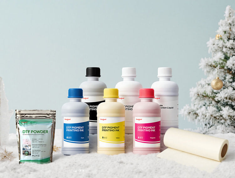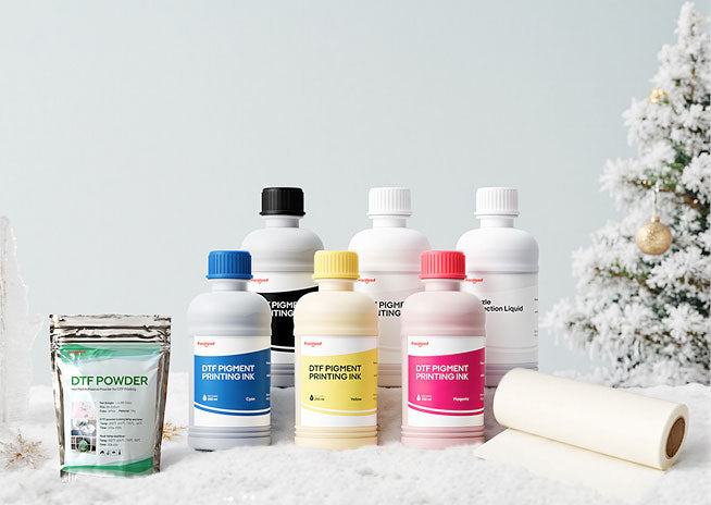 Includes 1 Roll Film, 1 Transfer Film Ink (500ml), 1 White Ink (500ml), 1 Transfer Film Powder (2kg), and 1 Nozzle Protection Liquid (500ml)