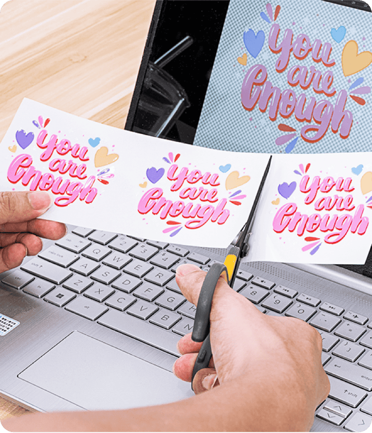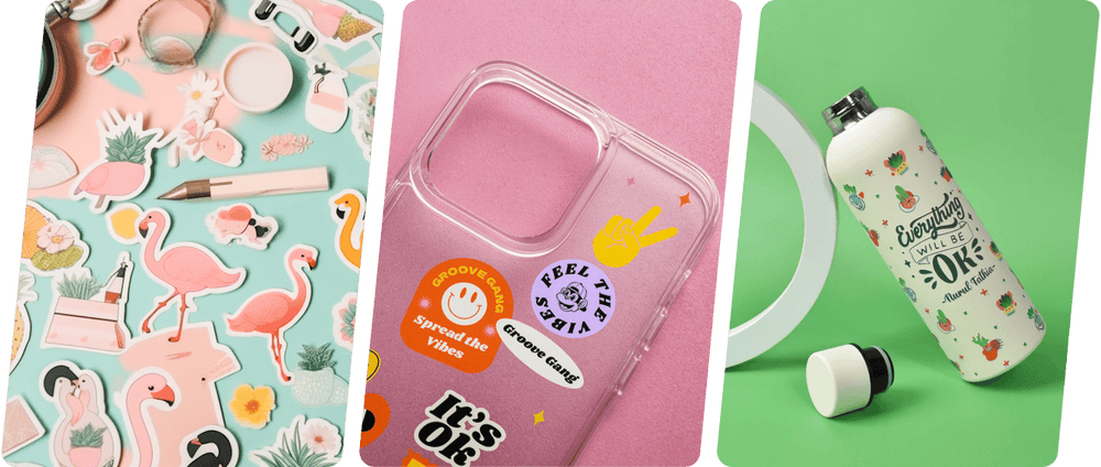 The printer produces a variety of decals that adhere to flat, curved, metal, plastic, wood, and other materials, making them ideal for branding, packaging, customization, craft supplies, and decor.