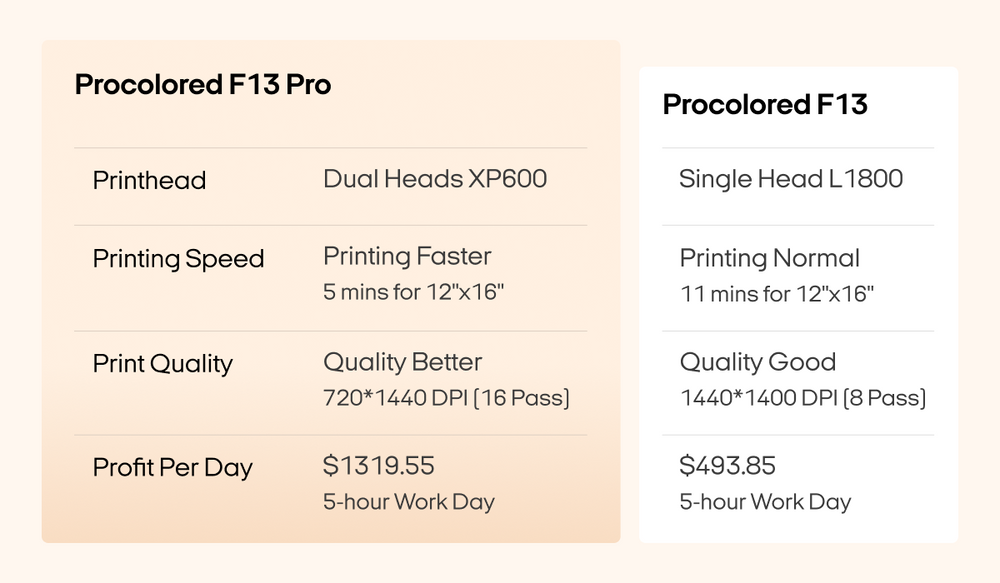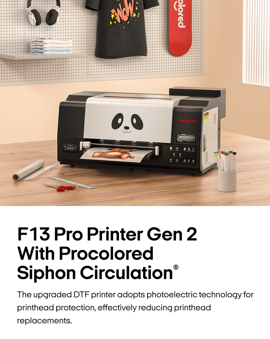 The Procolored F13 Pro is an advanced, user-friendly DTF printer with dual print heads. It produces professional-quality prints at incredible speed.