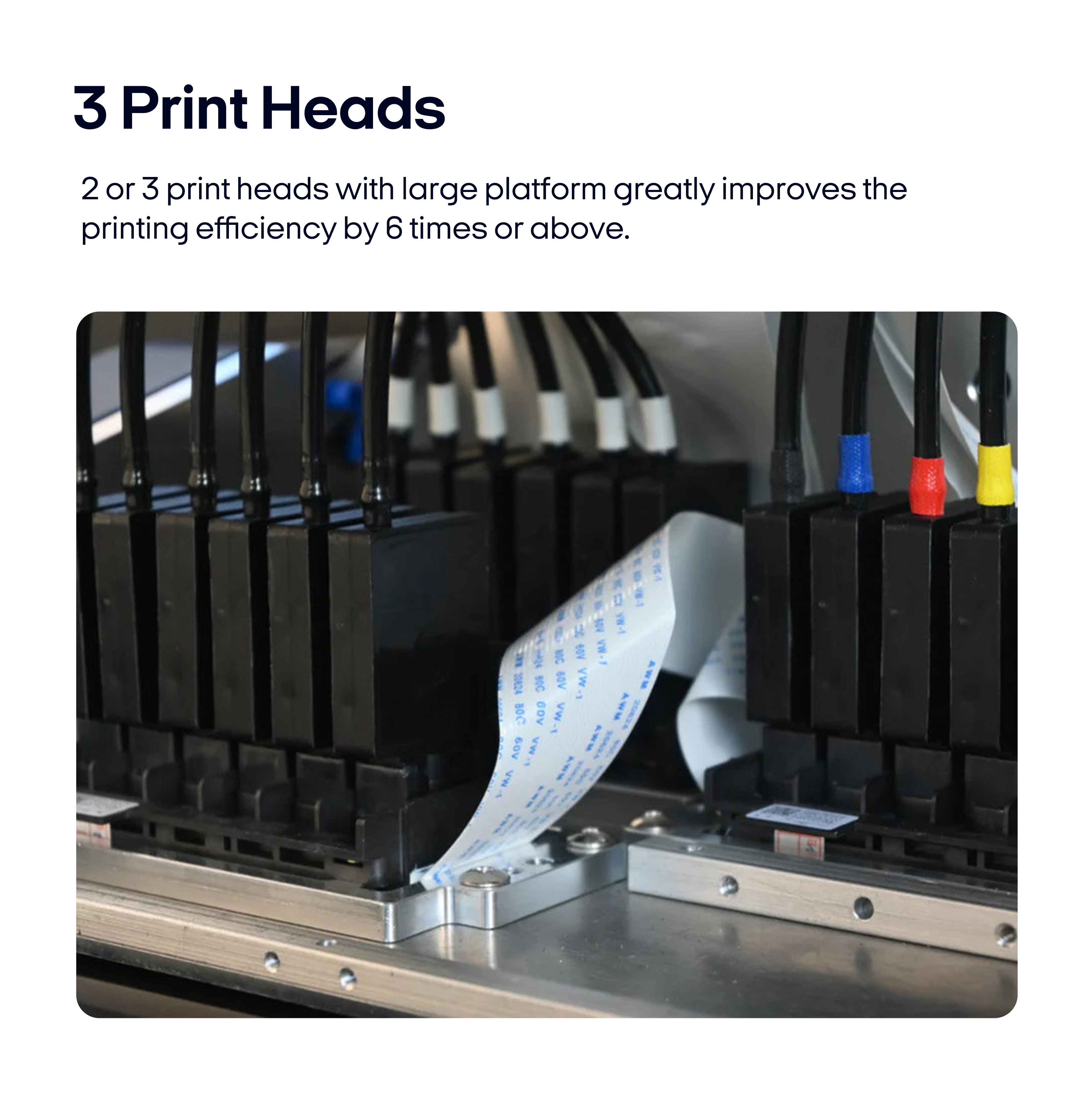 2 or 3 print heads with large platform greatly improves the printing efficiency by 6 times or above. With a negative pressure function of the ink sac, it's a good solution for saving ink and the printing effect will be more delicate.