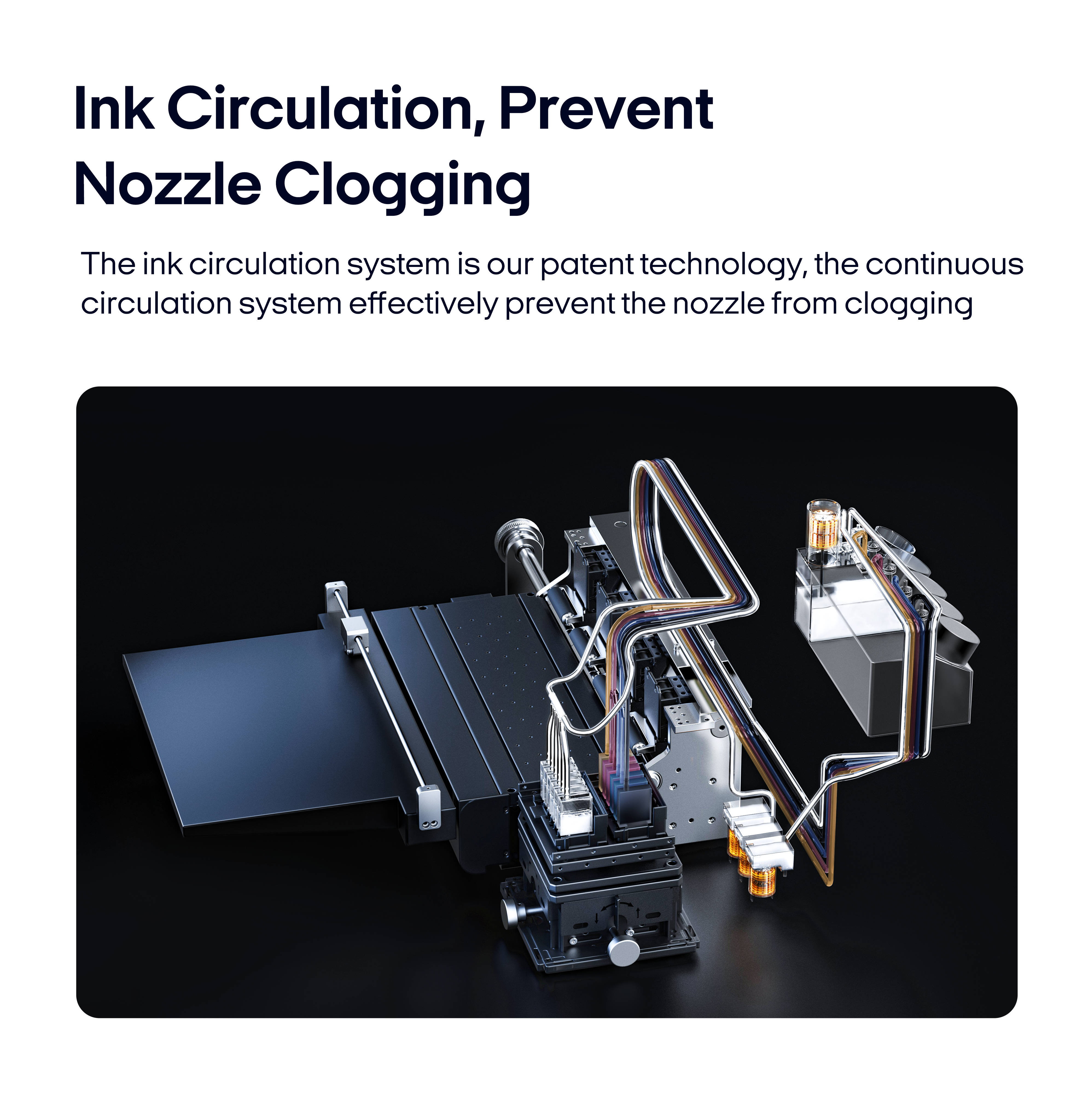 White Ink Automatic Circulation –minimizing printer head clogging possibility and greatly extend print head lifetime.
