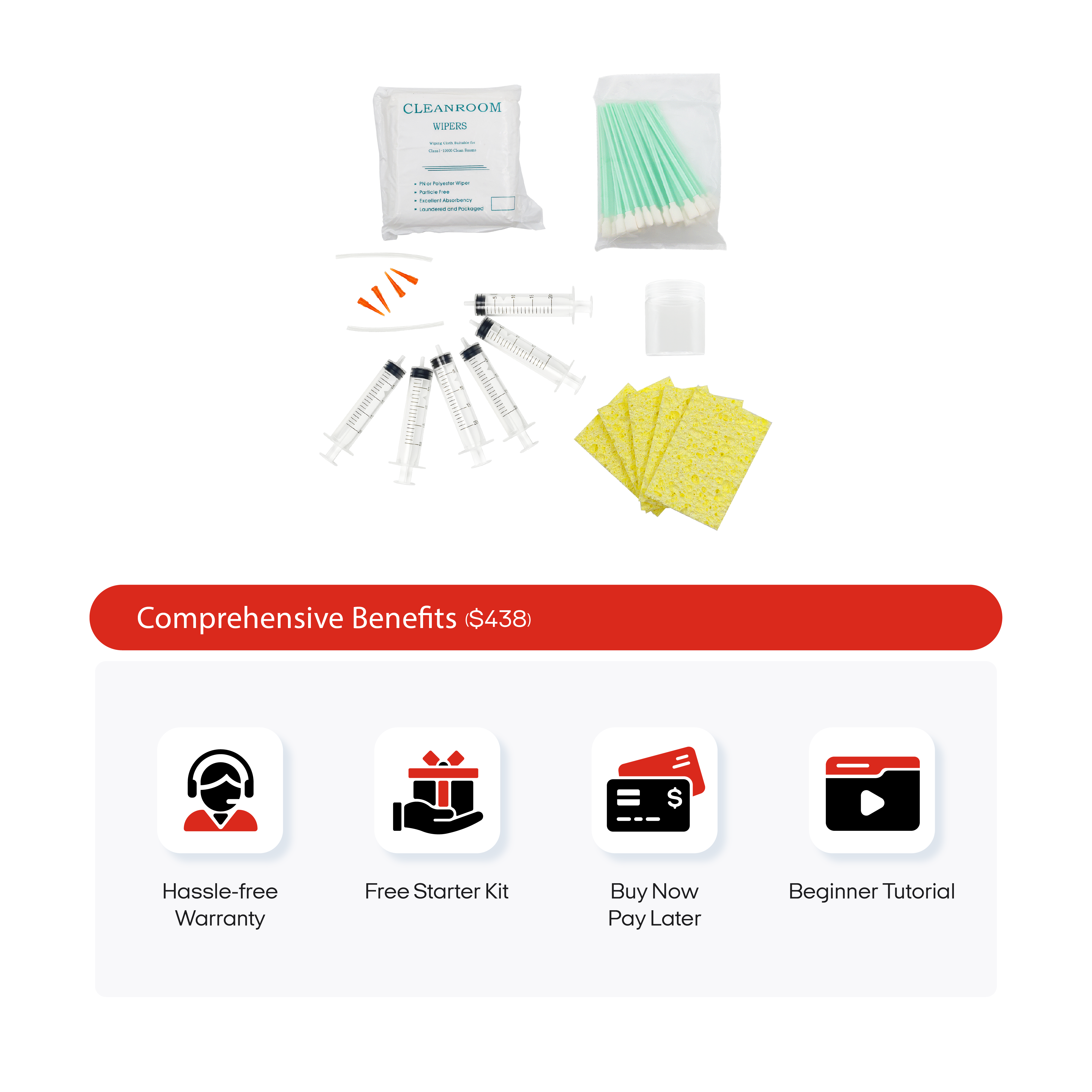 This cleaning kit encompasses: lint-free cloth, lint-free swab, syringe, sponge pad, waste ink bottle. |