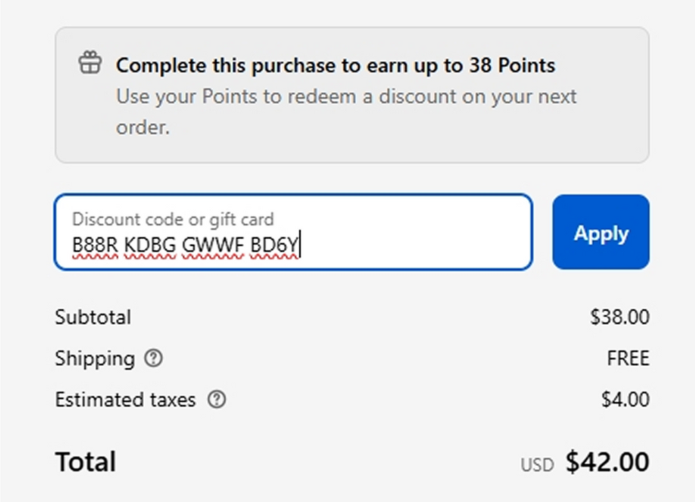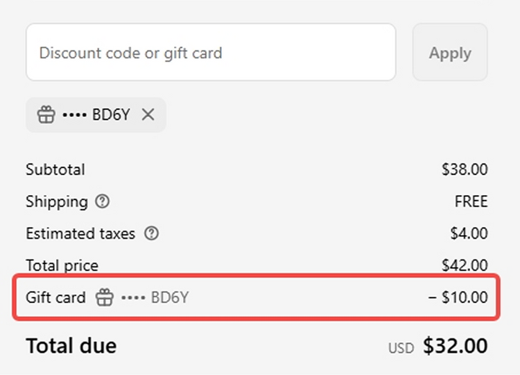 At checkout, enter your gift card code in the "Gift card or discount code" field and click Apply. The balance will be automatically deducted from your order total.