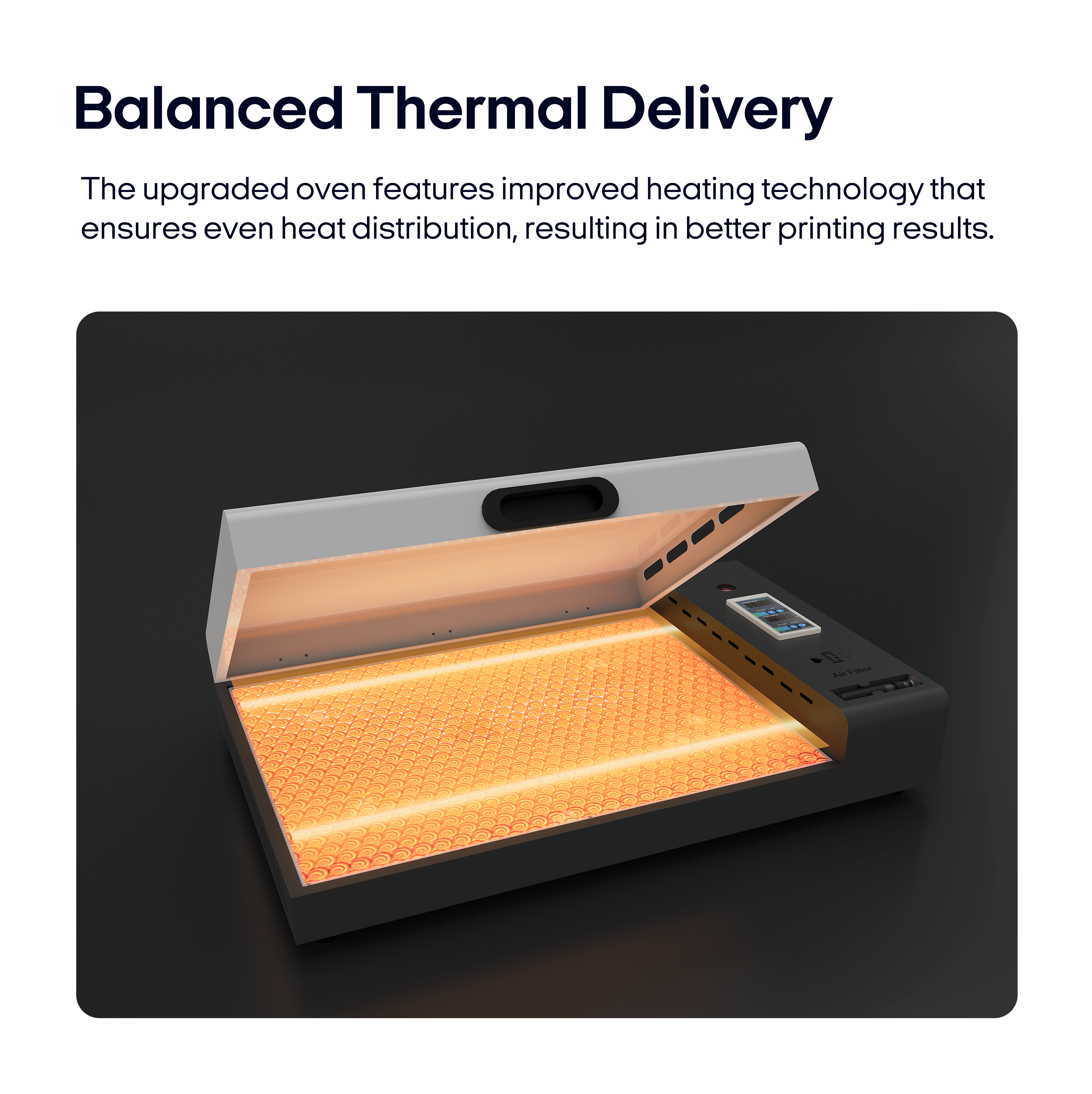 Even heating - The upgraded oven features improved heating technology that ensures even heat distribution, resulting in better printing results.